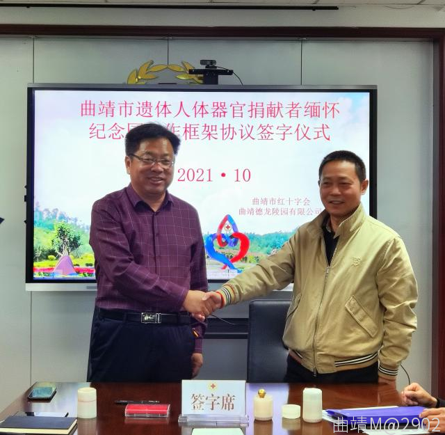 10月13日,曲靖市紅十字會舉行曲靖市遺體人體器官捐獻(xiàn)者緬懷紀(jì)念園項(xiàng)目建設(shè)簽約儀式,曲靖市紅十字會與曲靖德龍陵園有限公司正式簽訂了項(xiàng)目建設(shè)協(xié)議書。該紀(jì)念園的建成是我市首個,云南省第五個遺體人體器官捐獻(xiàn)者紀(jì)念園。市紅十字會干部職工、志愿者代表,曲靖德龍陵園有限公司董事長,總經(jīng)理參加簽約儀式。